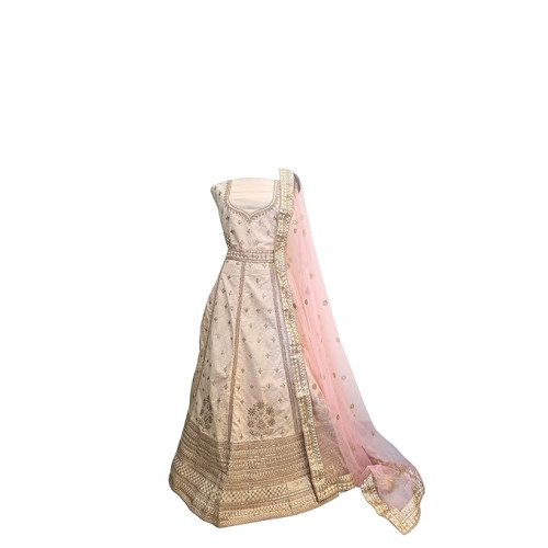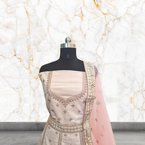 - Stunning Design: Elegant beige with intricate embroidery in golden sequence zari work or embellishments.Designer fully handwork choli with matching detailing and feature a front sweetheart neckline and back round neckline. You can make your own fit with choli. Dupatta : Soft pastel light pink with delicate borders or light embroidery.