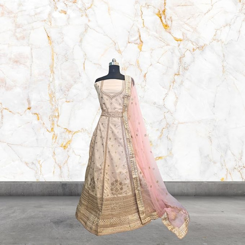 Women's Designer Cotton Silk Beige Lehenga Choli Embellished with Golden Metal Zari Work and Light Pink Dupatta Set